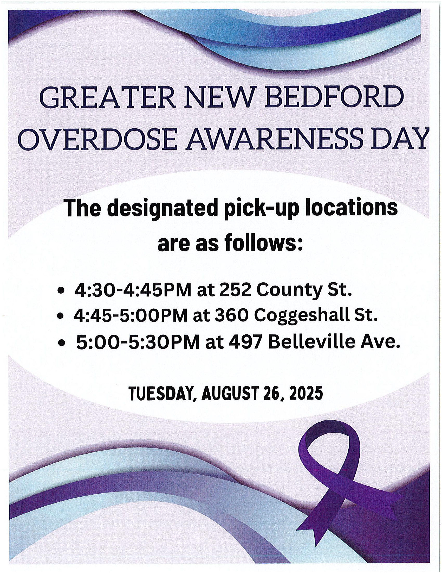 GREATER NEW BEDFORD OVERDOSE AWARENESS DAY Tuesday, August 26th, 2025 Beginning at 5: 30 p.m. at City Hall Followed by a procession to Custom House Square at 6: 00 p. m. Event ends at 8:00 p.m.